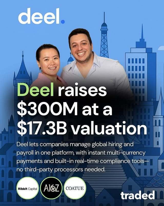 💼 Deel closed $300M Series E at a $17.3B valuation, extending its lead in global payroll automation.