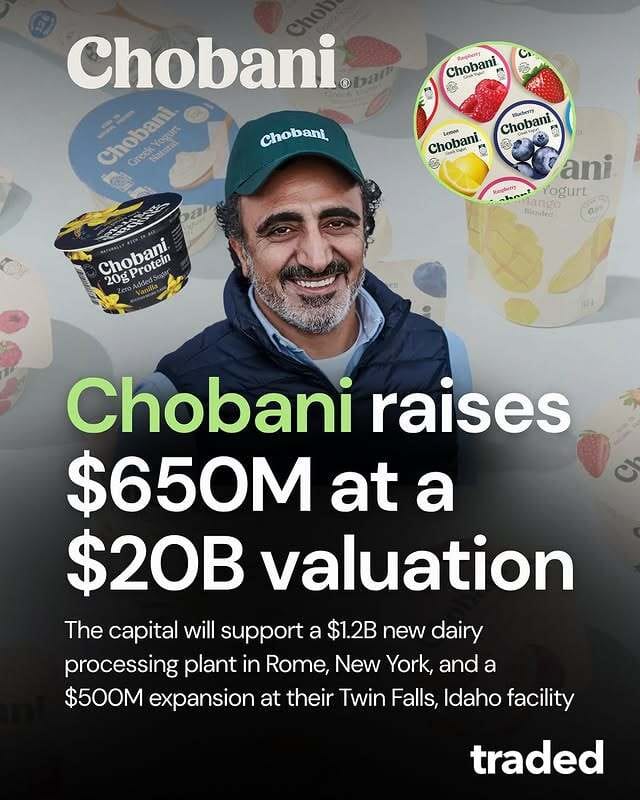 🥛 Chobani raised $650M to fund new U.S. dairy plants, valuing the yogurt maker at $20B.
