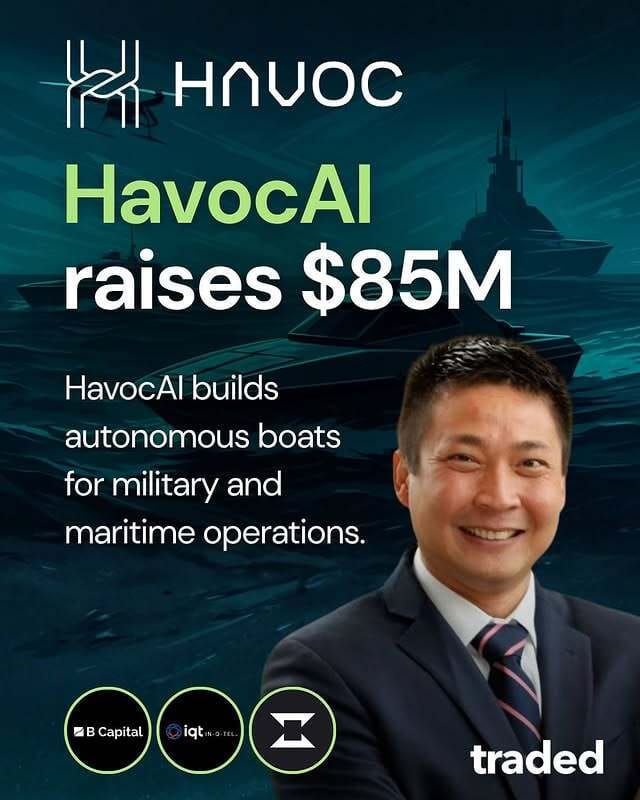 2️⃣ HavocAI – $85M in undisclosed funding to build autonomous maritime intelligence systems for the defense sector.