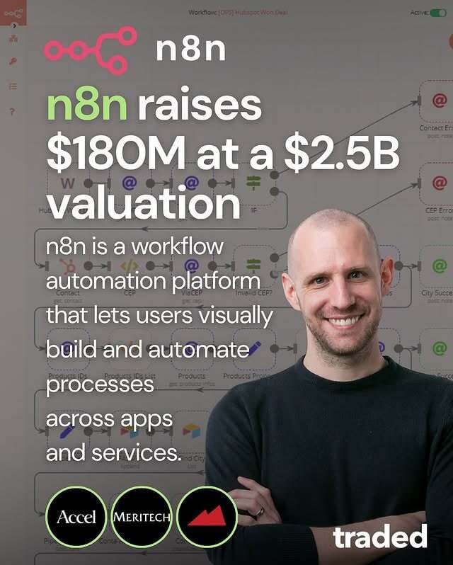 3️⃣ n8n – $180M Series C led by Accel, joining the growing list of workflow automation unicorns.